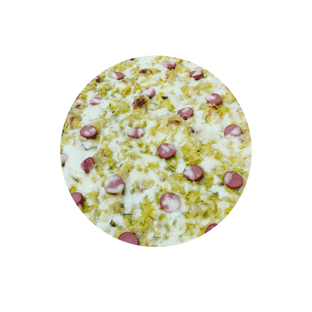 Il condimento abbina patate fresche tagliate a fette sottili, mozzarella filante e wurstel a rondelle, il tutto profumato con rosmarino fresco e condito con sale e un filo di olio extravergine d’oliva. Una combinazione che crea una pizza saporita e ricca, perfetta per chi ama piatti più sostanziosi.